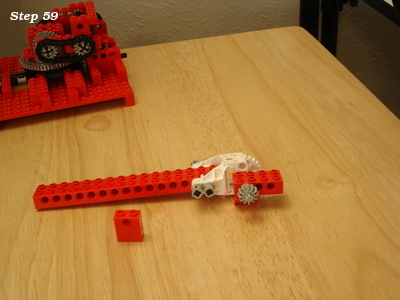 Generally in Lego models you will see limited rotation and the elevation control mounted on the turret itself. I wanted the controls in the platform instead. Rotation of the turret is accomplished by driving the turntable with a gear, and the elevation of the barrel by an axel going through the center of the turntable. The problem is that if that's all you do, the barrel will raise and lower itself as you rotate the turret.
